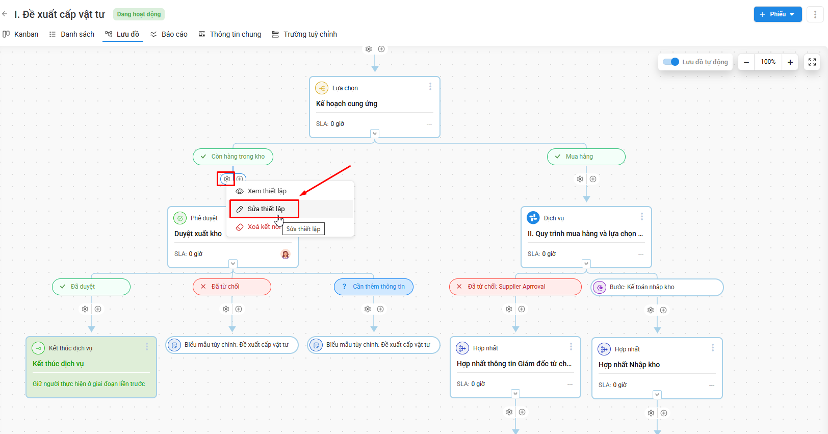 Bước 2: Tại dây kết nối (khối kết nối) với khối phê duyệt, click vào icon để sửa thiết lập