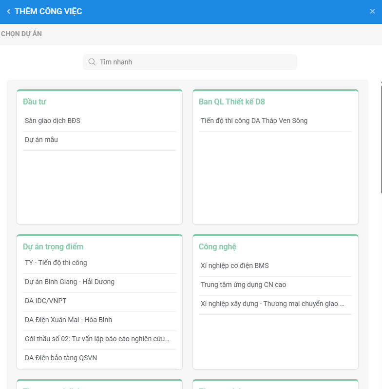 - Chọn Dự án bạn cần thêm công việc :