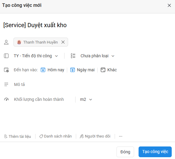 - Sau khi chọn Dự án, bạn tùy chỉnh thông tin công việc (tên công việc, người nhận việc, thời hạn,...) và nhấn Tạo công việc để lưu thông tin