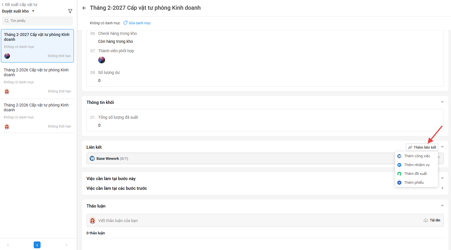 Bước 1: Nhấn vào 1 Quy trình >> chọn Phiếu cần thêm liên kết