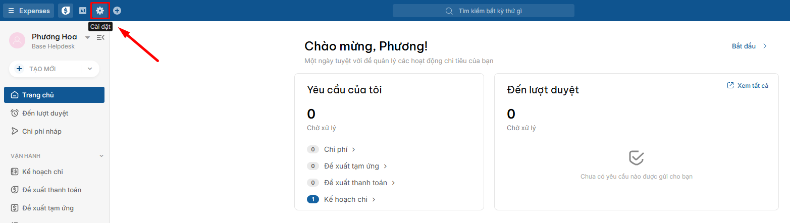Để bắt đầu cấu hình, Admin truy cập Expense - Nhấn vào biểu tượng Cài đặt (hình bánh răng) > chọn mục Tiền tệ.