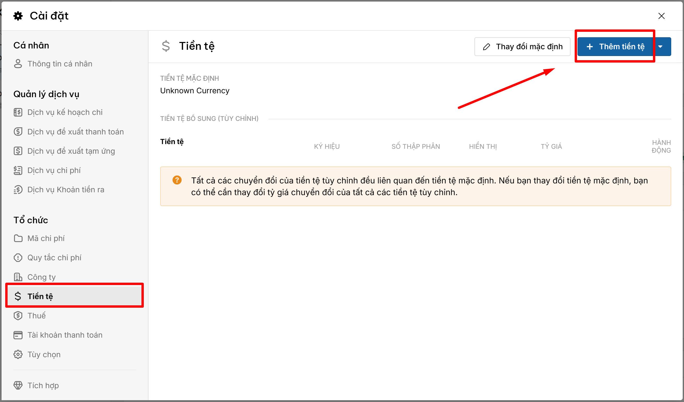 + Click nút + Thêm tiền tệ ở góc trên bên phải.