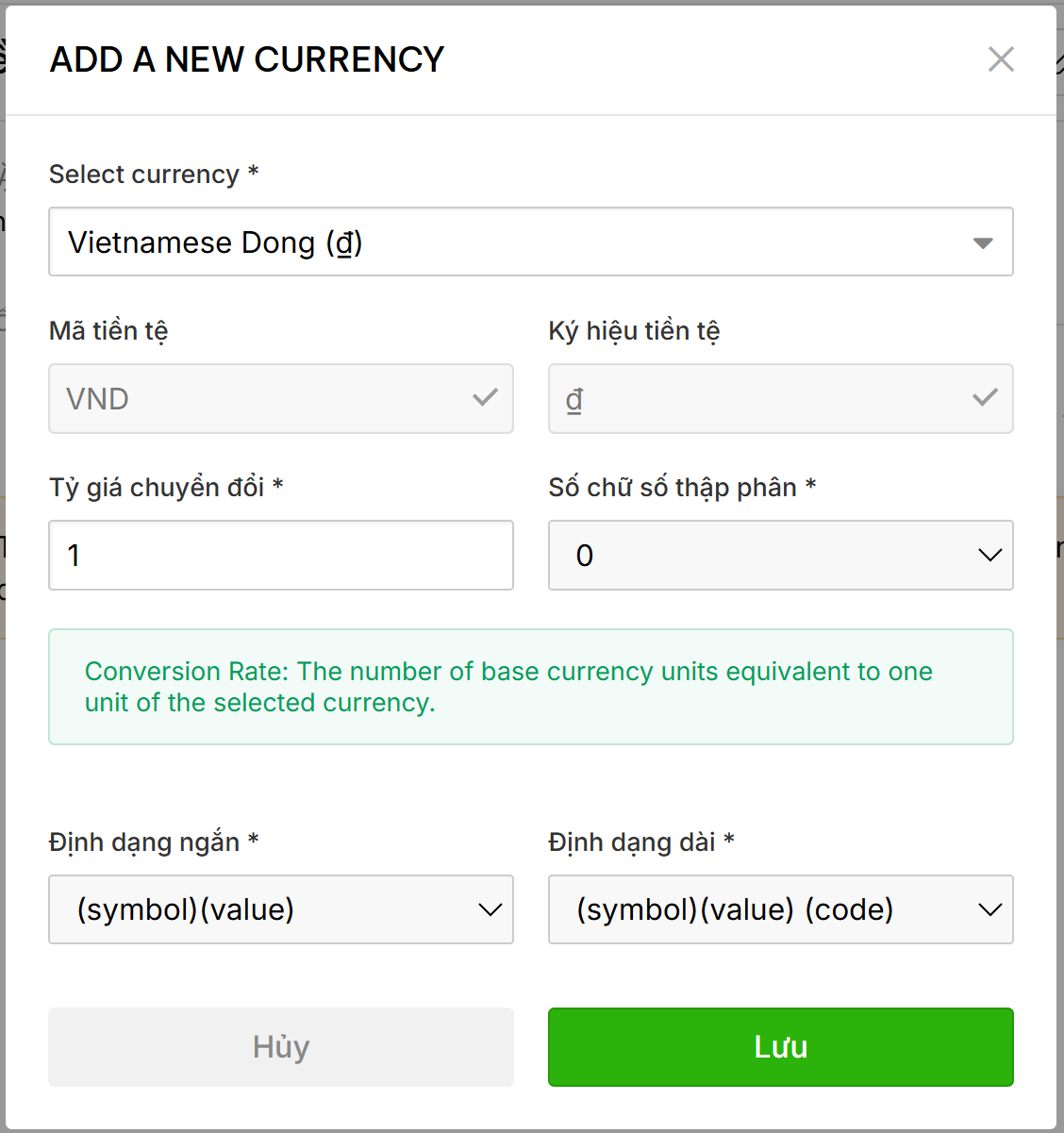 + Định dạng: Hệ thống sẽ tự hiển thị Mã tiền tệ, Ký hiệu. Bạn có thể tùy chỉnh Số chữ số thập phân (ví dụ: VNĐ thường để là 0, USD để là 2) và Định dạng hiển thị (ngắn/dài).