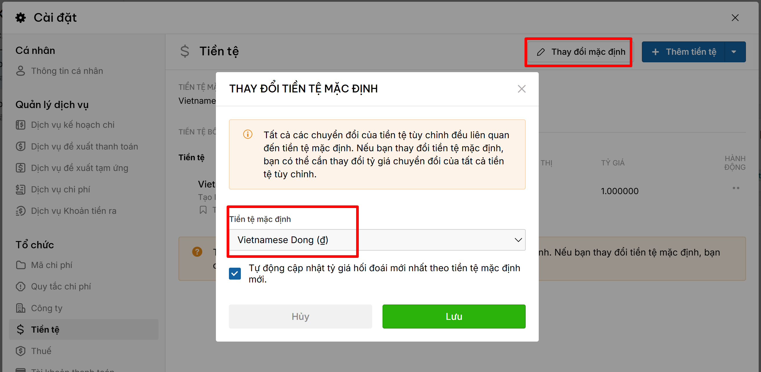 Tại giao diện danh sách tiền tệ, click nút Thay đổi mặc định.