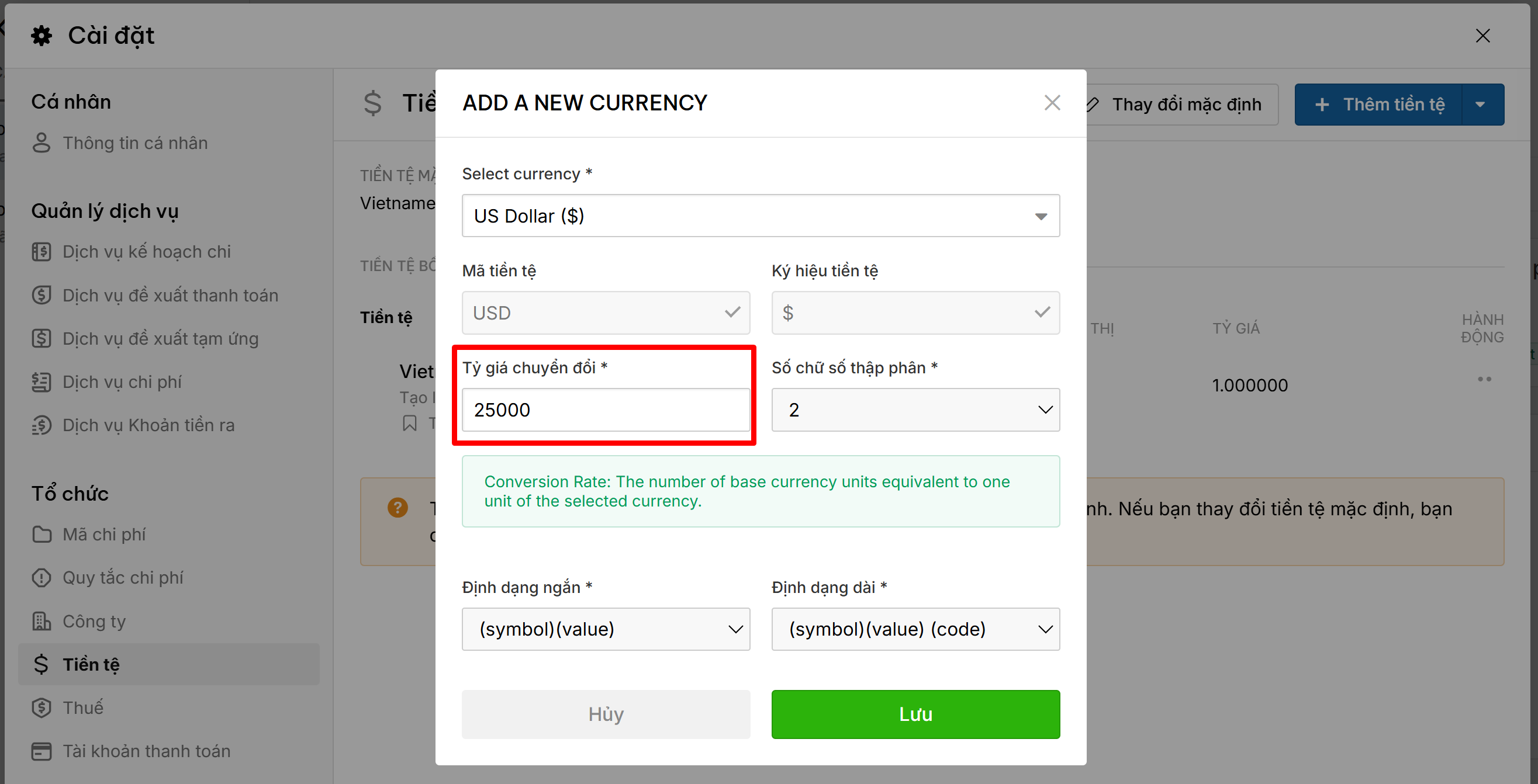 - Tại ô Tỷ giá chuyển đổi: Nhập số lượng đơn vị tiền tệ mặc định tương đương với 1 đơn vị tiền tệ đang thêm. Ví dụ: Nếu tiền tệ mặc định là VNĐ, khi thêm USD bạn nhập tỷ giá là 25000 (nghĩa là 1 USD = 25.000 VNĐ).