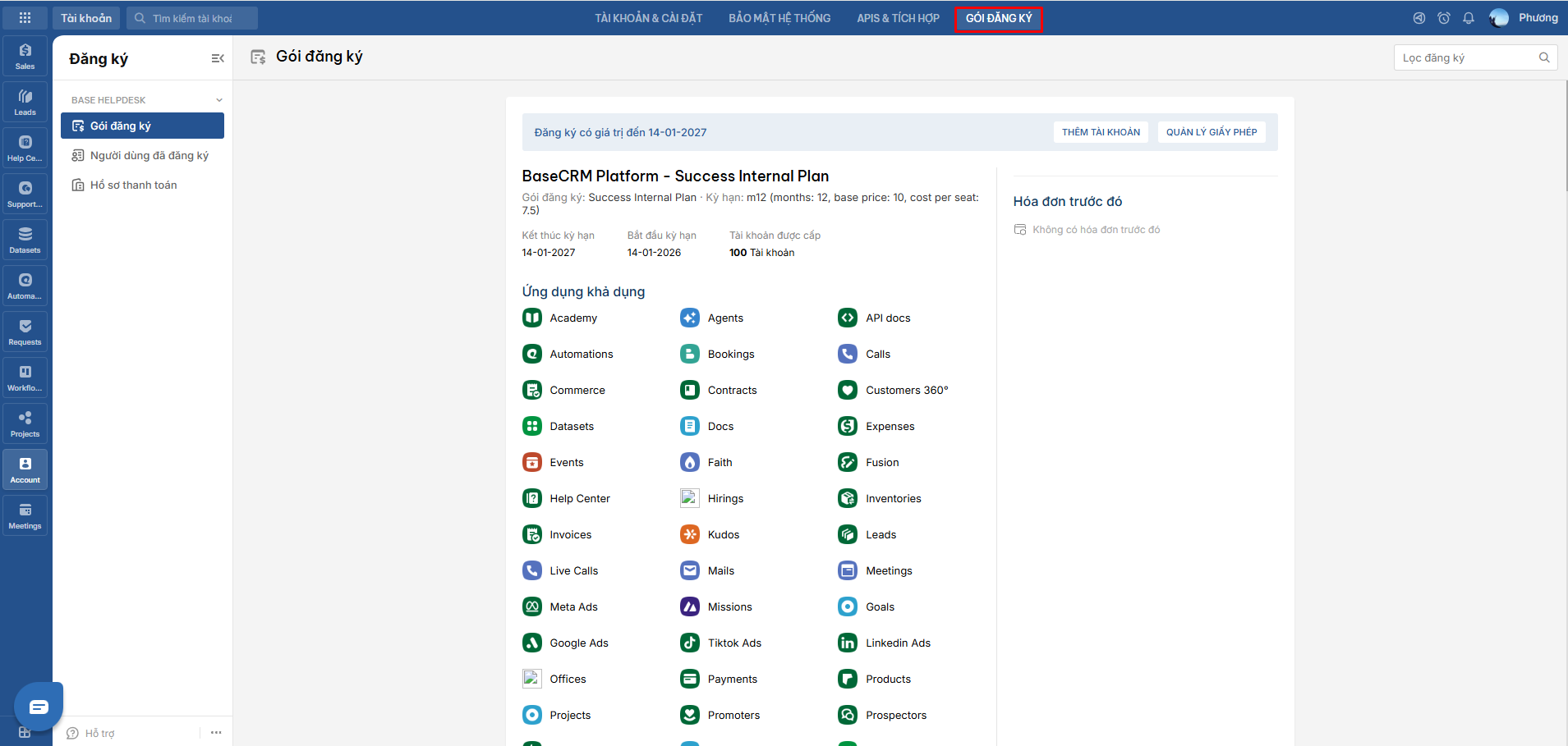 Bước 1: Truy cập vào app Account >> Tại menu ngang, chọn Gói đăng ký