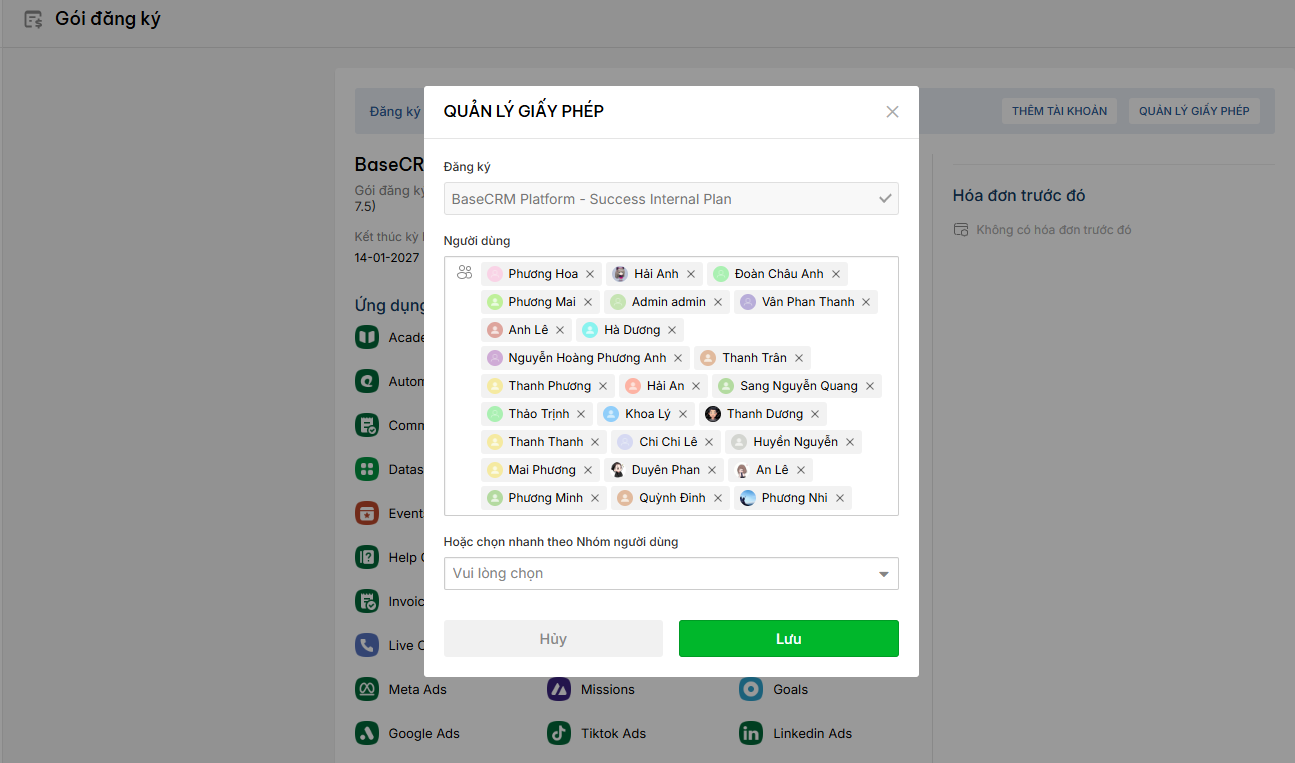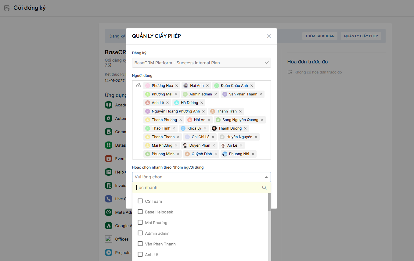 Bước 2: Chọn gói cần phân quyền >> Click Quản lý giấy phép
