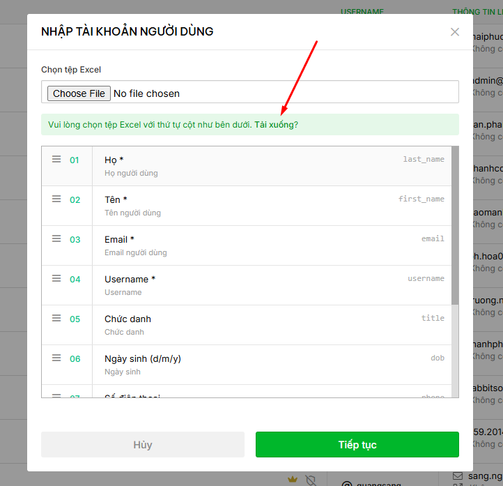 Bước 2: Bạn click vài Tải xuống để tải file mẫu của hệ thống