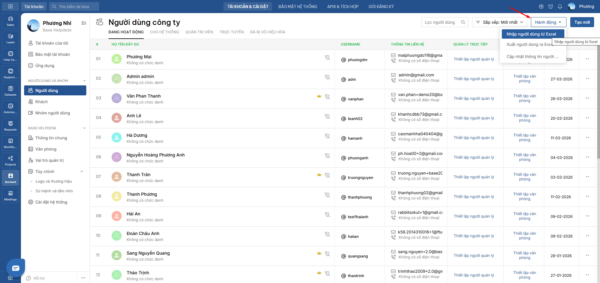 Bước 1: Truy cập vào ứng dụng Account >> Tài khoản & Cài đặt >> Người dùng >> Di chuột vào button Hành động và chọn Nhập người dùng từ Excel.