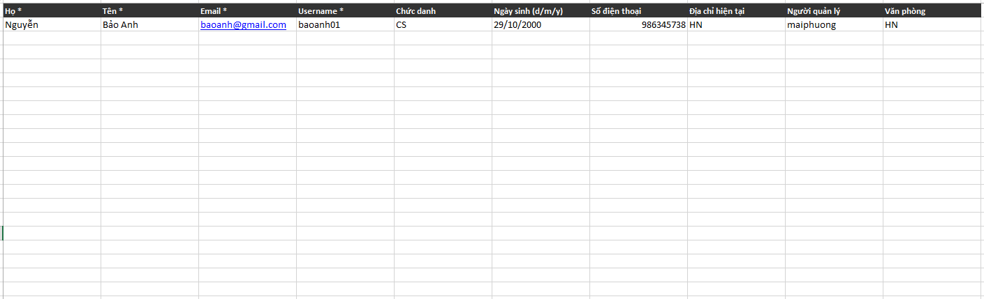Trường hợp có nhiều tài khoản cần tạo mới trên hệ thống, thay vì tạo thủ công từng tài khoản, bạn có thể chuẩn bị file dữ liệu và nhập từ excel để tạo. Thao tác này chỉ dành cho Chủ hệ thống hoặc Quản trị ứng dụng Account.