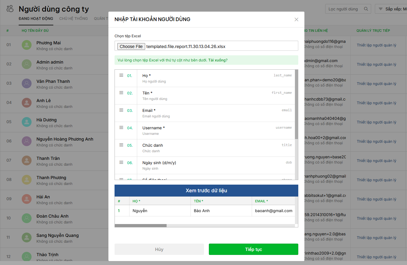 Bước 4: Sau khi đã hoàn thiện file dữ liệu, bạn quay lại màn hình Bước 2, click Choose file để chọn file và Xem trước dữ liệu để kiểm tra lại thông tin, các cột trong file đã khớp với các cột theo cấu hình chưa >> Tiếp tục