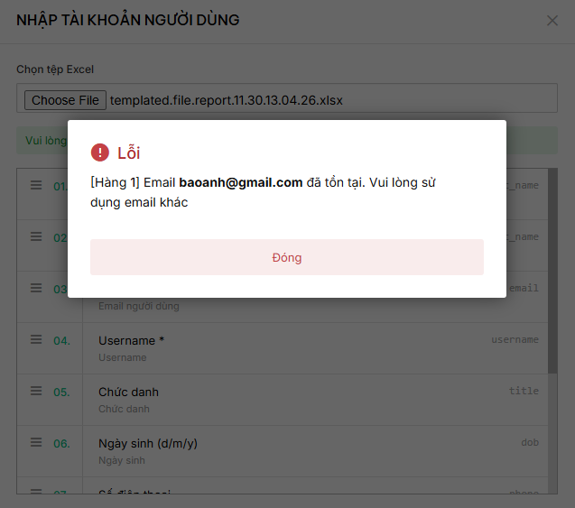 Trường hợp nếu dữ liệu trong file có lỗi hoặc không đúng định dạng hệ thống sẽ hiển thị lên cảnh báo ngay tại màn hình, bạn cần kiểm tra lại Hàng và thông tin hệ thống báo lỗi và sửa lại lỗi tương ứng.
