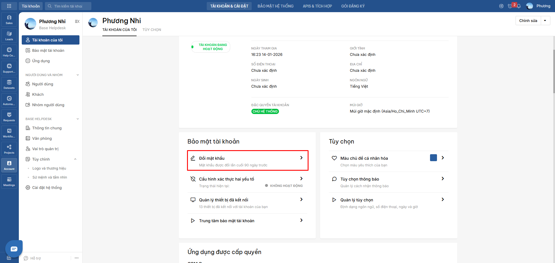 Để thay đổi mật khẩu tài khoản của chính mình, bạn truy cập vào app Account và thao tác theo hướng dẫn sau: