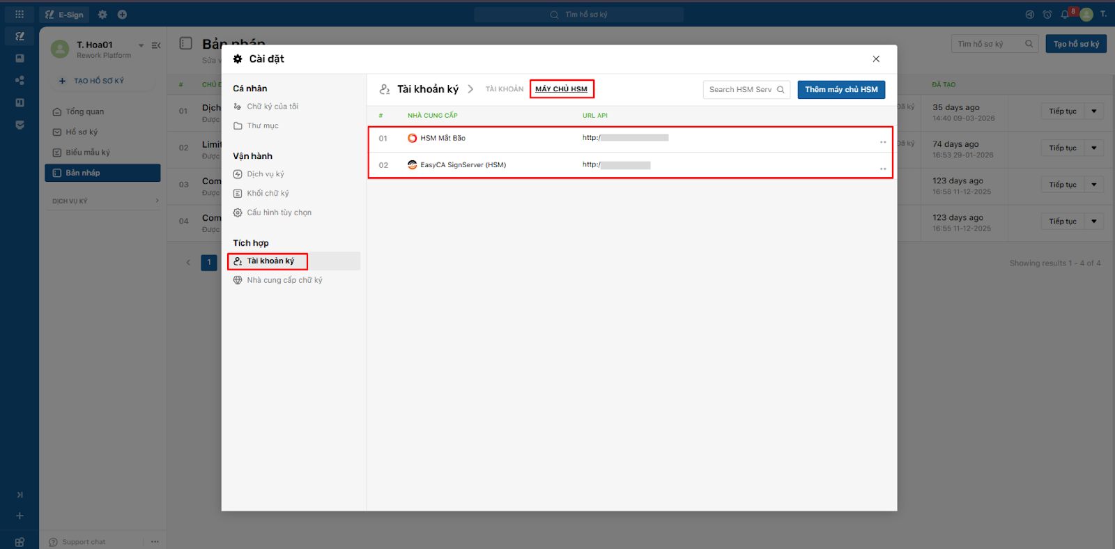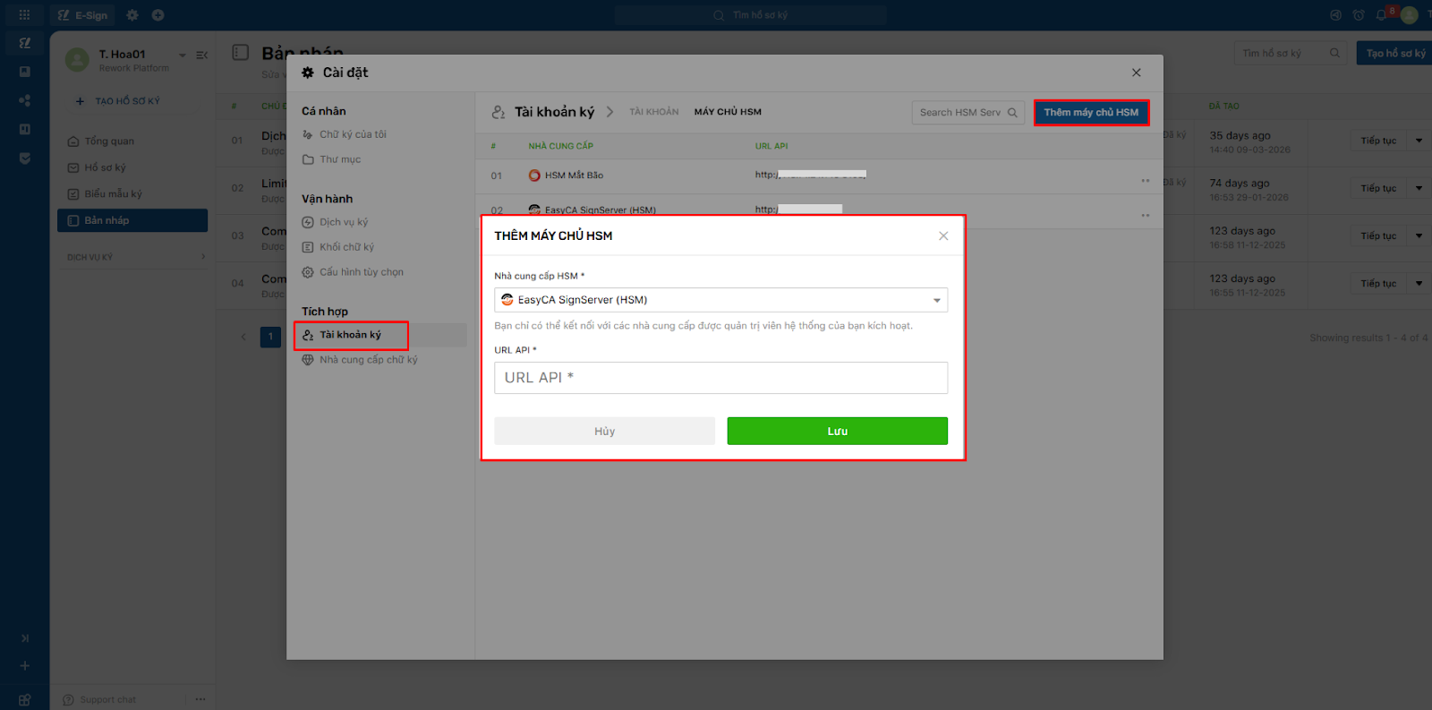 Tại màn “Tài khoản ký” thực hiện thao tác bấm vào “Máy chủ HSM”:Sau khi bấm vào “Máy chủ HSM” thì hệ thống sẽ điều hướng đến màn danh sách máy chủBước 2: Bấm vào nút “Thêm máy chủ HSM” để mở form nhập thông tin máy chủ:API URL: nhập đường dẫn server do Easy CA (HSM) cung cấp=> Sau khi thêm máy chủ sẽ trả về màn hình danh sách máy chủBước 3: Quay về form liên kết để chọn EasyCA SignServer (HSM) để thực hiện liên kết tài khoản: