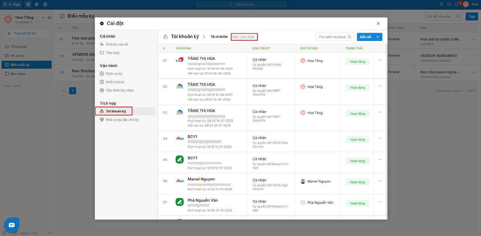 Sau khi lưu form thì hệ thống sẽ trả về danh sách tài khoản ký chứa tài khoản ký vừa liên kết